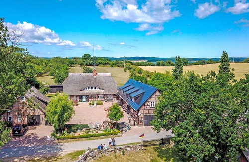 Beautiful it is not - Welcome to the Reddevitzer Hövt on Mönchgut! Here, on the peninsula Mönchgut Rügen, on the Reddevitzer Hoeft (a promontory surrounded on three sides by water), you will find one of the most beautiful courtyards of the island of Ruegen. The peninsula is a UNESCO biosphere reserve Southeast Rügen. The stylish Dreiseitenhof offers a magnificent view over the Rügischer Bodden and on the opposite coast. Here you can go hiking, do awesome long bike rides, fishing in the fish-rich waters, swim at the private beach, play in the garden or just unwind. The left wing of the Dreiseitenhof is home to four modern country-style holiday apartments, each with a lake view and Wi-Fi (up to 3 bedrooms, 6 guests). On arrival the beds are of course already aufbezogen for you with linens. Towels Please bring along. More details can be found in the description of the apartment. In just ten minutes drive you can reach the seaside resorts Göhren and Baabe with the sandy beaches. Each bungalow has a car - parking space. Until the bus stop of public transport is approximately 1 500 meters. We promise you a relaxing holiday - let your soul dangle.
