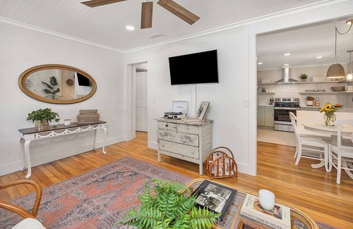 Welcome to this 1940s beach bungalow! Kick back and relax in this calm, stylish space. Vintage-inspired and fully renovated, and only .5 miles from the beach! Below you will find information on the property and a detailed description of each room. Yard: front yard is large enough to enjoy a game of crochet or bocce ball. Porch: Includes swing, 2 rocking chairs and table that seats 4 guest. Parking: space for 2 cars. Please park in driveway only. Living area: lots of natural sun light, comfy couch, papasan chair, TV with Roku, and record player. Kitchen: fully stocked kitchen with all the cookware, dinnerware, glassware, linens, coffee & coffee grinder and utensils. Bathroom: shower and tub combination. Bathrobes and shower caps provided. Turkish beach towels. Bedroom 1: Queen bed, dresser, closet, blackout shades, work space with comfortable chair and lighting. Bedroom 2: Twin beds, dresser, closet and 42 in. TV with Roku and blackout shades. Laundry room: This is the owners shed but we do allow guest to do a load of laundry. **Each bed includes 400 thread count bedding and Nectar memory foam mattress. *