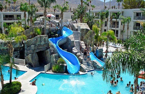 The stunning Palm Canyon Resort & Spa were you can discover serenity while soaking up the warmth and listening to the cascading waterfalls surrounding the 1.5 acre swimming pool and sun deck. Explore lush grottos, rest in the in-cave whirlpool spa, or share the delightful water slides for both adults and children.