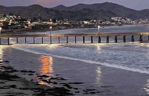 Pet Friendly Wheelchair accessible One level - no steps. End unit with private deck and views that are breathtaking. Remodeled and immaculate condo. One block to downtown Cayucos. Queen size bed in bedroom with 42 inch TV. Living room has a large rollaway bed and 55 inch TV. Ocean views from kitchen and living room. 8 foot patio door opens to large deck with Pub table and BBQ overlooking the Cayucos pier and downtown. In the distance is Morro Rock. The waves can be heard through out the unit. A vacation to remember. We only have level entry - no steps.