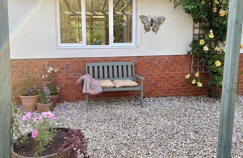 Bedroom: Kingsize (5ft) Bed Ensuite: Cubicle Shower, Bath, Toilet. Underfloor heating, electricity, bed linen, towels and Wi-Fi included. Welcome pack. Enclosed garden with lawn, sitting-out-area and garden furniture. Private parking for 2 cars. No smoking.. This detached property is peacefully secluded yet close to local amenities. It’s a walker’s haven with the Black Mountains, Brecon Beacons and Offa’s Dyke, The Herefordshire Trail and Marches Way all nearby, as well as walks from the doorstep like Blakemere Wood which is on the edge of the Golden Valley.
