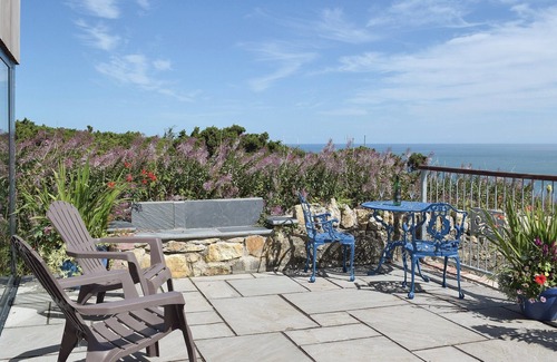 Bedroom: Double (4ft 6in) Bed Ensuite Wet Room: Shower, Heated Towel Rail, Toilet. Gas underfloor central heating, electricity, bed linen, towels and Wi-Fi included. Travel cot and highchair available on request. Welcome pack. Washing machine and tumble dryer (shared with owner). . Enclosed terrace with garden furniture and BBQ. Private parking for 1 car; additional on road parking. No smoking.. If dramatic coastal views are something on your wish list for that perfect holiday, look no further. View at the Peak is aptly named because of the glorious views from this glass fronted property, perched high above Goodwick harbour with commanding, unobstructed views over Fishguard Bay and out towards Dinas Head and Mount Snowdon. For keen walkers you can enjoy some of the 186 sublime miles of the Pembrokeshire Coast National Park footpath from the doorstep as the footpath runs past the gate. Enjoy a stroll into the harbour village of Goodwick, complete with a local pub, restaurant and lovely harbour walks out along the promenade. Take some time out at the Goodwick Ocean Lab and learn all about marine wildlife set on the waterfront, here you can also enjoy a freshly brewed coffee.