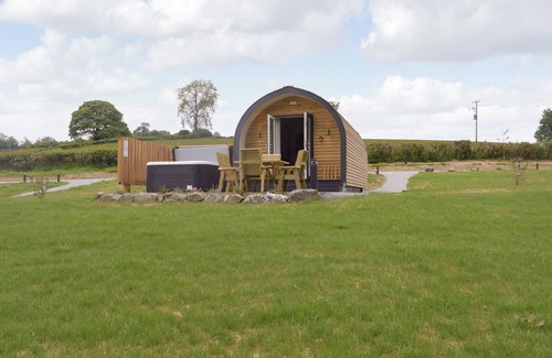 Shower Room: Cubicle Shower, Heated Towel Rail, Toilet. Gas central heating, electricity, bed linen, towels and Wi-Fi included. Welcome pack.. Patio with garden furniture and BBQ. Hot tub (private). Private parking for 1 car. No smoking. Please note: There is a river in the grounds, 50 yards away.. Set on one level, this open studio-style accommodation has everything needed for a romantic break. Situated in the Welsh countryside, the pod comes complete with private patio with a hot tub and barbecue for your enjoyment. From the French doors leading to the patio, you can sit out in the evening dining alfresco with a cool glass of wine.