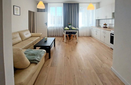 This bright and well-kept city flat offers you the opportunity to enjoy the urban amenities of Koszalin while spending relaxing days on the nearby coast. The simple elegance of the furnishings creates a pleasant atmosphere in which you can plan your activities in peace, prepare your favourite dishes in the modern kitchen and relax on the sofa after a long day. Make yourself comfortable and feel at home.