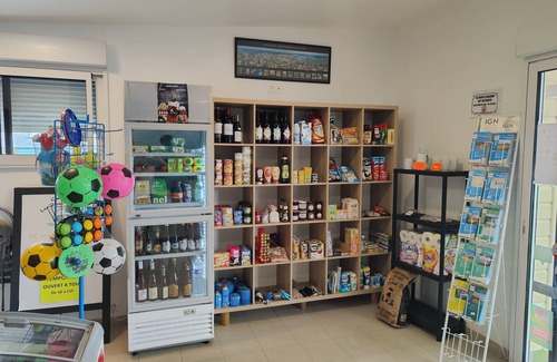 Kitchen equipped with: 2-burner gas hob, fridge, storage, electric coffee maker, kettle, dishes and utensils