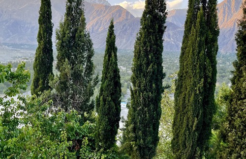 One-sided full glass window for the gorgeous views of fruits and nuts orchards, ivory peaks and Gilgit River, home cooked delicious Pakistani food is offered.