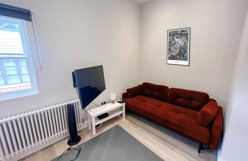 This recently refurbished flat in Richmond offers high-standard accommodation for up to four people, complete with brand new furniture and a sofa bed. It's conveniently located near Thames restaurants, Richmond Park, and Kew Gardens. Access is via stairs, but no elevator is available, potentially causing difficulties for families with young children or those with disabilities.