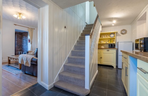 Cottage style and well equipped for self catering with electric oven and hob, free standing fridge freezer, washing machine, microwave, toaster and kettle. Cafetière for coffee. Flooring is tiled. From here into the...