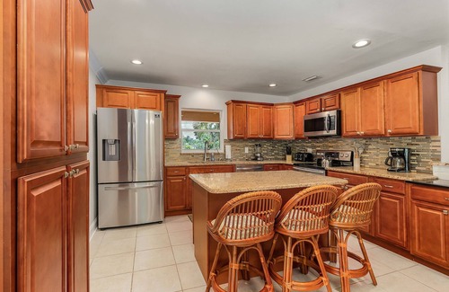This home boasts a large open concept kitchen and living room areas. Enjoy lounging under the Lanai, swimming in the pool, or playing yard games. This house is equipped with everything you'll need to kick back and enjoy your vacation.