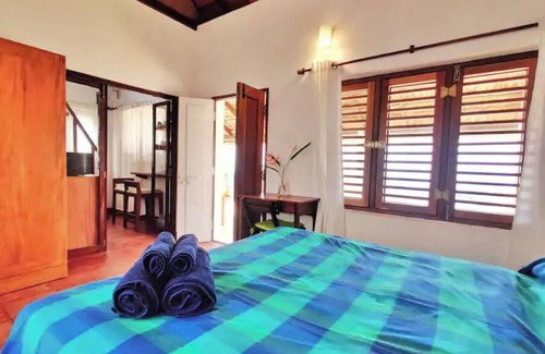 The cottage has a very comfortable, air-conditioned bedroom, with a queen-size bed and an attached en suite modern bathroom. The windows open up the room even more and let in an abundance of light and sea-breeze.