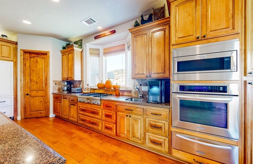 Separate living rooms, multiple sitting areas, five fireplaces, numerous smart TVs, and a home gym in one of the bedrooms let you choose how you want to enjoy your downtime inside. The impressive kitchen is more than equipped to handle gourmet meal prep, with features including a gas range, other high-end stainless steel appliances, a large island, ample counter space, two dishwashers, and well water that tastes wonderful!