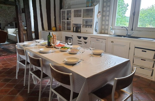 You can enter the house from the living room, cars can be parked right outside. The comfortable living room with 2 sofas, a TV, DVD player gives access to the kitchen with a table for 12, a large functional period fireplace. It is equipped (hotplates, oven, dishwasher, microwave, American fridge (fresh water and ice cubes at will), coffee maker, kettle, toaster, SodaStream ...