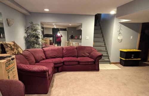 This is a quiet partially wooded property. 1600 square foot studio is located on lower level of house. This is a shared entrance to the shared laundry room and half bath that leads to the private entrances of the two units. Walking down the flight of stairs leads to this wonderful studio unit.