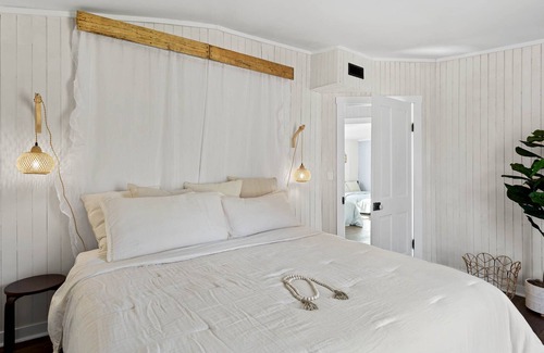 Upon entering the home you’ll be welcomed with high ceilings and French doors that lead to the sitting room equipped with a decorative fireplace set in stone and a solid wood mantle. You’ll feel like you stepped back in time as you take in the original beadboard walls throughout the house, but you’ll have access to modern amenities such as a lighted, jetted jacuzzi and high-speed internet.