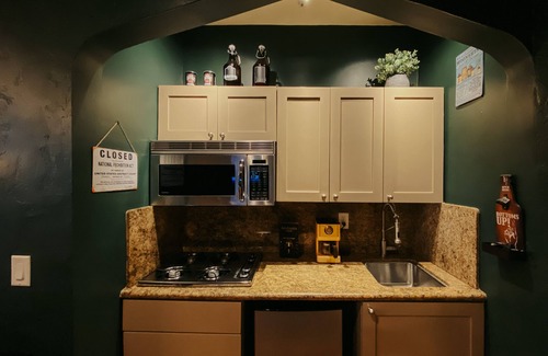 Come indulge yourself in this lavishly furnished speakeasy suite! Help yourself to a drink and meal in the kitchenette that's equipped with a stove top, microwave and fridge. Need a cat nap after all that fun you're having? Enjoy sweet dreams from underneath the cover of a soft, crushed velvet duvet. There are also velvet, black out curtains that will help ensure a relaxed snooze. On especially cold evenings, the bed also has an electric, heated mattress for you to enjoy! Don't worry- it may be 1920s in the decor, but it's present day on the Apple tv where most major streaming platforms can be enjoyed. Need to freshen up? Enjoy a shower or bath in the restroom that has the original, hand-painted tiles from when the building was built.