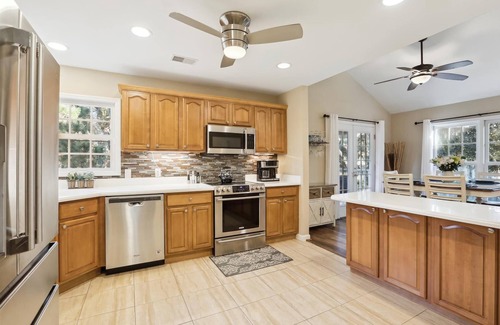 ✹ Stylish, Airy Interior: Relax in a spacious living area with a plush sectional and smart TV, and enjoy cooking in a modern kitchen with stainless steel appliances.