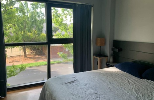 The apartment is considered to be a studio but there are french doors that separate and provide some privacy from the bedroom to the living room.