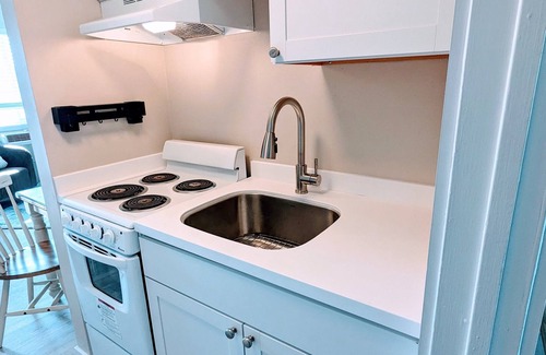 The brand-new kitchen is stocked with cookware, silverware, glasses, paper towels and dish soap. There’s a Keurig coffee maker, microwave, refrigerator, stove top, and oven. The new bathroom has a step-in tub and is stocked with toilet paper.