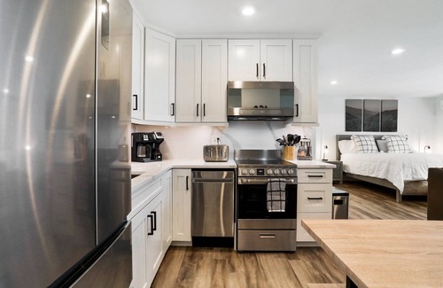 The new designer kitchen boasts quartz countertops, under cabinet lighting, slow-close cabinetry, high-end stainless steel appliances including a refrigerator, range, dishwasher, microwave, and deep sink. Just step out the back door and you are brought outside to a mountainside panorama with views of the ski mountain during the winter months and fireworks from the resort during the summer. The stone fireplace is for decorative purposes only. Front and center is a mounted 70” Samsung LED smart TV that allows guests to use Wi-Fi to easily access a range of apps including Netflix, Amazon, Disney+ and more since Cable TV is not provided. Other amenities include: Wi-Fi, Individually Zoned Climate Heating, Luxury Vinyl Plank Flooring throughout the entire condo, Major Techology upgrades like a Bluetooth speaker and a backlit mirror that has a dimmable and anti-fog function, Premium Shower Heads, Full Washer and Dryer, High quality linens, quilts, pillows and throws, as well as a Keurig & 12-cup Coffee Pot (in one!).