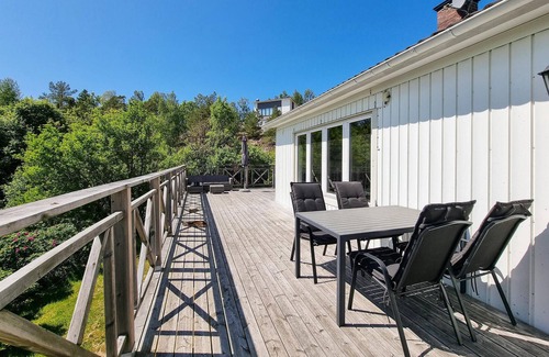 Exclusive vacation home in Brastad with ravishing views over mountain and fjord. The tastefully furnished house is located only 300 m from the water and a short drive from cozy Lysekil. The house has an open plan layout and is flooded with light from the large window sections. The beautiful bathroom is fully tiled and the kitchen is practically furnished. Behind the living room is a spacious terrace where you can enjoy the view over mountains and the glittering Bredungen, part of the beautiful Gullmarsfjord. 300 meters from the house you can take a refreshing swim or fish for mackerel. If you want to experience something more, you can drive to Lysekil, where Havets Hus is certainly worth a visit. In Bohuslän lies Nordens Ark, a unique facility for the whole family.