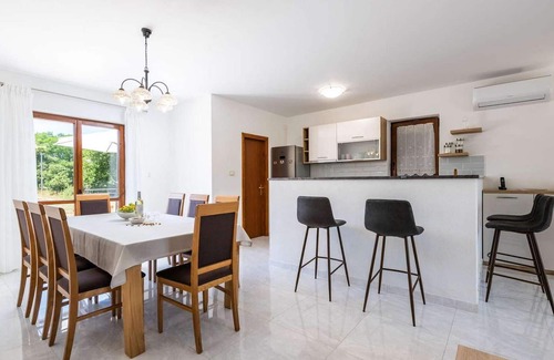 The tourist town Rabac with its beaches and varied gastronomic and sports facilities is 12 km away. On completely enclosed property it offers to the guests two terraces, sun loungers, barbecue, seating set, badminton/volleyball net and several parking spaces.