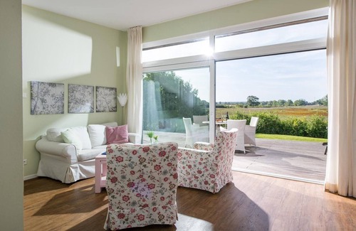 High ceilings and huge window fronts characterise the interior of the holiday home. While the open-plan kitchen offers all the amenities of high-quality equipment, a solid dining table and the spacious living room with stove invite you to linger.