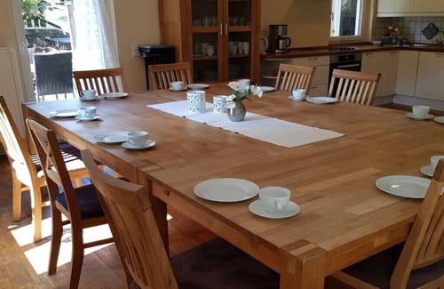 The 260 m² holiday apartment in a former mill building was completely renovated in 2022. The 9 bedrooms on two levels, all with double beds, and a family room with a children's bed and a single bed, as well as 3 bathrooms and a guest toilet, are part of the apartment, as well as a private sauna. The open-plan living area consists of a living room, dining room, and kitchen. From here, you have access to the balcony or terrace, which are equipped with patio furniture and barbecues. The two large dining tables in the living room offer enough space for shared meals or to plan the next day. The furniture is high-quality, with cabinets and tables made of solid oak. The amenities include a wall-mounted TV, stereo system, DVD player, Wi-Fi connection, etc. The high-quality, fully equipped kitchen leaves nothing to be desired: a refrigerator-freezer combination, dishwasher, ceramic hob, oven, and a variety of appliances. We look forward to your visit.