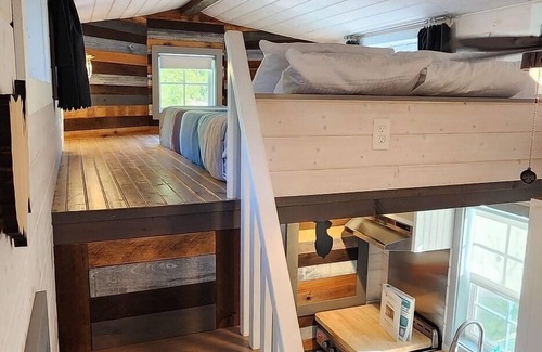 The Tennessee Tiny Home is your home away from home, miniature edition. Your stay in this unit is an experience like no other. Equipped with a full kitchen including fridge, stove, oven, microwave, and coffee maker, a full bathroom, AC/heat, and a pull out couch to provide everything you need to feel right at home. The dual sleeping lofts provide sleeping for four with a queen bed and two twins. Situated along the creek, the deck, picnic table, and fire pit ensure you are able to relax outside as well.