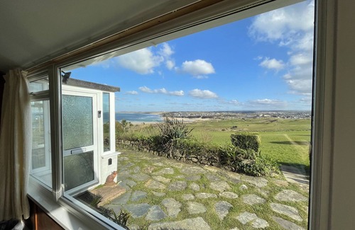 Nestled between Carbis Bay and the picturesque village of Lelant, Church Lane is a peaceful, scenic route that leads to The Links—a secluded retreat at its far end. Accessed via a private lane and bordered by the renowned West Cornwall Golf Course on two sides and open fields on the third, this stunning holiday home boasts uninterrupted panoramic views across St Ives Bay. From the iconic Godrevy Lighthouse, sweeping past the golden Towans at Gwithian, to Lelant’s very own Porthkidney Beach and its rolling dunes—this is a truly breathtaking setting. The famous St Ives branch line, which winds through this landscape, is easily accessible, with Lelant station just a 30-minute stroll away.
