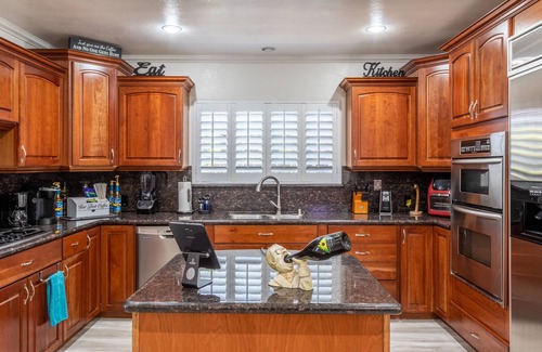 The fully equipped kitchen features modern stainless-steel appliances for preparing delicious breakfasts, snacks, or four-course gourmet dinners. Ample countertops and a central kitchen island offer plenty of room to unleash your cooking creativity.