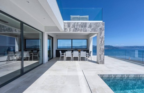 From the ground floor there is an exit to a spacious courtyard, divided into two parts. In one part, which is covered, there is an outdoor kitchen and a dining table with a barbecue that will gather friends or family in unforgettable gatherings, while the other part is dominated by a spacious pool with a sun deck. What the whole yard has in common is certainly a unique view of the Adriatic Sea and islands!