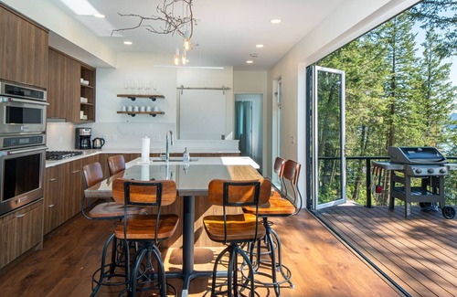 Completed in summer of 2022, the Tree Haus brings a modern aesthetic to a rustic setting. Floor 1 has a welcoming entryway and garage access. Stairs lead up to floor 2 - the main living area of the home. The open concept kitchen and living room are framed by accordion style doors that bring the outdoors in, providing access to the expansive outdoor patio. Take in the lake views as you barbeque, dine, & relax outdoors. Enjoy your private hot tub during the cool Montana evenings. The modern, fully equipped kitchen features high-end appliances and has everything you need to prepare memorable meals to share with your group. The custom wood dining table is a gathering place to share a meal and unwind from a day of adventure. Relax and reconnect in the adjoining living room, featuring gas fireplace & television with streaming capabilities. Floor 2 also has a queen bedroom with bathroom and custom shower.