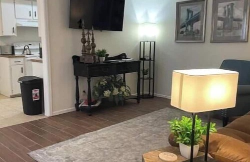 Kick back and relax in this newly remodeled calm, stylish space. Enjoy great mattresses, sheets and pillows! Set up for a relaxing getaway. This 2 bedroom duplex features a king bed with flatscreen fire tv in the master. The second bedroom has a queen bed for your comfort. The bathroom has a tub/shower, lighted makeup mirror, hair dryer and great linens . The kitchen has what you need for a great cup of coffee or a glass of wine or quick meal. Garage, 2 lounge chairs and charcoal grill.