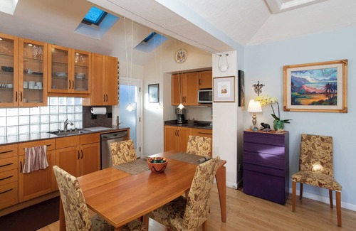 You will be charmed the moment you open the door of our mid-century Shell Beach cottage with its 21st century remodel inspired by visits to 5 Star resorts world wide. Our jewel box features a contemporary chef's kitchen with all stainless steel appliances, vaulted, sky-lit ceilings, an expansive master bedroom with a gas fireplace and zen meditation nook, light filled studio and a luxurious master bath with deep soaking tub.