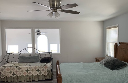 Back to the home. Beautifully, renovated almost everything is new top to bottom, inside and out. For your sleeping pleasure the downstairs bedroom has a pillowtop queen mattress and a Casper full mattress both have gel pads on top. The sofa is a queen pull out. Upstairs we have a Stearns and Foster queen, a purple king mattress, and a daybed.