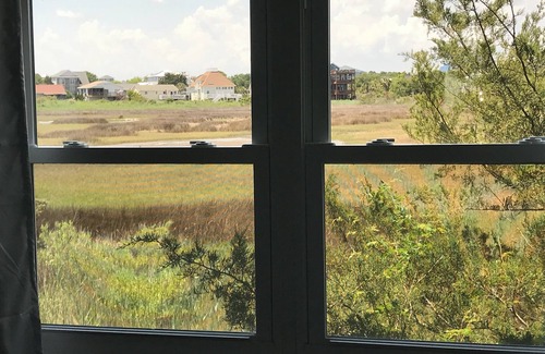 The kitchen features refrigerator, electric stove, microwave and dishwasher. It includes cookware, dishes, glasses, coffee cups, silverware, drip coffeemaker and Keurig, and an assortment of accessories. Unit has washer/dryer combo for easily washing wet towels and swimsuits. Back patio overlooks the marsh - soooo relaxing!. Basic towels, washcloths, shampoo, conditioner, and liquid body soap are provided.