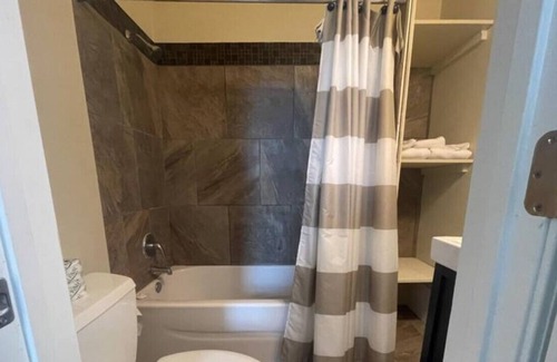 Discover the epitome of relaxation in two brand-new king bedrooms, each meticulously designed with raised frames for additional storage beneath. Sink into the embrace of plush pillow-top mattresses, ensuring a profoundly rejuvenating night's sleep. Each bedroom boasts a flat-screen smart TV, a desk for convenience, a dresser for your belongings, and a tastefully tiled bathroom.