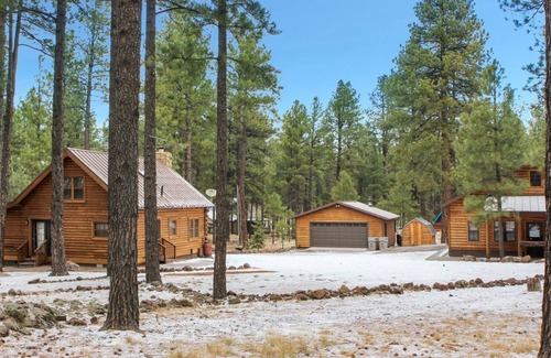 This beautiful property sits among 3 acres in tall Ponderosa Pine trees in the beautiful Kaibab forest. There are 2 cabins on the property included in the price. The main cabin features a beautiful kitchen with granite countertops, a living room with a large stone wood burning fireplace and flat screen tv. There is an amazing spacious loft (3 twin beds and 2 queen beds) with sleeping for 7 people. There is one downstairs bedroom with a queen sized bed (sleeps 2) and full bathroom. This cabin has a large covered front porch to sit and watch the sunset, read a book, bird watch, or just enjoy the beautiful scenery and weather. The guest cabin features a large living room with tv, wet bar, fridge, toaster oven, blender, and a bathroom with a shower. This cabin also has a LARGE game room equipped with a flat screen tv, ping pong table and poker/game table. There are plenty of games, cards, books, and toys to keep everyone entertained! This cabin also has two rooms upstairs. One room has a queen bed, the other has a king-sized bed. Outside the main cabin is a beautiful paved patio with a wood bench swing, fire pit (wood supplied), propane BBQ and a regulation size horseshoe pit. There is plenty of room for children to play on the property. Including a NEW (2021) children playground set and a child’s zipline! We are 23 minutes west of Flagstaff, 8 minutes from Bearizona, about 9 minutes east of the historic Route 66 town of Williams, AZ. We are about 40 minutes to Snow Bowl ski resort. Also, it is about an hour from our door to the South Rim of the Grand Canyon and little under an hour to the beautiful town of Sedona with red rock cliffs and gorgeous trails. Plenty of nearby hikes and things to do. Several small lakes to fish in close by. Bring your hammock, there are numerous pine trees on the property to relax underneath! The area recently received record snow in winter 2023. Between October to April there is a chance to have occasional snow fall! Just added a Tesla/electric vehicle 220 outlet at guest cabin electrical panel!