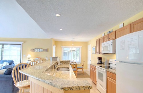 The condo is comfortably decorated throughout and offers amenities for comfort and entertainment value. Enjoy the open floor plan which flows from the kitchen and dining area to the living area complimented by a cathedral peak ceiling and two sets of sliding glass doors that lead to a wide wrap-around deck. The deck has chairs & tables to take in the coastal breeze and observe the natural surroundings. Sink into comfortable living room furniture after a day of golf or beach activity and enjoy the 43" large screen Roku TV (Netflix/Hulu - guests must use own streaming accounts), DVD player and overhead ceiling fan while relaxing. The condo has central heating & air conditioning for year-round comfort. The kitchen is fully equipped, and an adjacent dining area has a table with seating for four with additional seating at the raised kitchen bar for four. The kitchen has been completely renovated with new cabinetry, granite counters/dining bar with 4 bar stools & all new appliances. Each bedroom has two double beds with new soft bedding, (TV in master bedroom - streaming only) and adjoining full baths. The front bedroom also features a private screened porch accessible only from this bedroom. The master bedroom has a door to access the back deck as well as a walk-through closet which adjoins the bath. A laundry room located by the front entry hall has a full-sized washer/dryer for guest use. The community has an outdoor pool, charcoal grills and picnic area, tennis courts with basketball goal for outdoor guest activities. The community is directly located on Oyster Bay Golf Links along the 2nd hole and is a short drive to Sunset Beach which is a scenic barrier island beach with high dunes and soft white sand. Sunset Beach offers soft white sand and is a wide beach with a wildlife sanctuary on the west end of the island. This condo serves as the perfect spot for a fabulous golf or beach vacation! The condo is smoke-free and includes complimentary linens, towels and departure cleaning service.