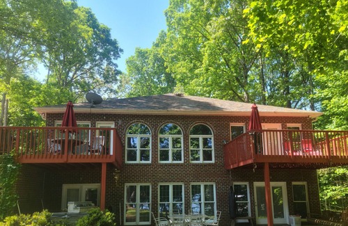 Waterfront home on Lake Hartwell, convenient to I85 and not far from Anderson, Seneca and Clemson. Four side brick home with an open floor plan and set for entertaining. Enter on the main level with a view of Lake Hartwell and the expansive Great Room down stairs with an 85" TV. To the right is a comfortable sitting area off the eat in kitchen, which opens to a deck, overlooking the lake. Opposite side upstairs is the Owners suite, with a fireplace, private deck, huge closet ; another bedroom and a full bath. Half bath for guests in the foyer area. There is a dual staircase with landing into a generous Great Room on the lower level, with fireplace, views of the lake with full windows on rear of the home. There is another bedroom with 2 queen beds and also an additional sleeping area with a twin/full bunk. Also on the lower level there is a foosball table and workout equipment. A closet under the staircase contains many games including cornhole. Also a cot and playpen are stored here for use. A path of pavers leads to the boat dock. The owner keeps their boat in the slip but there is plenty of room to tie up on the side.