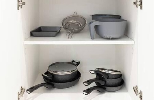Kitchen: Equipped with basic utensils and pots, kettle, toaster, vacuum, mop, broom, and a dustpan