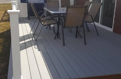 This new 1237 square foot townhouse has three bedrooms, 2.5 bath, single car garage, with AC & Wi-Fi. Through the sliding glass door is a private deck with, seating & a barbeque grill.
