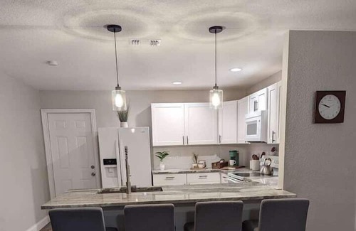 Experience the allure of mid-century modern interior design as you roll back time in this serene haven. Wake up rejuvenated in a peaceful, clean, safe, and spacious home away from home. The master suite boasts a modern queen canopy bed adorned with a unique fandelier, creating an atmosphere of sophistication. Enjoy the convenience of a complementary coffee bar equipped with both Keurig and drip options, along with a fully furnished kitchen featuring a dishwasher for added ease.
