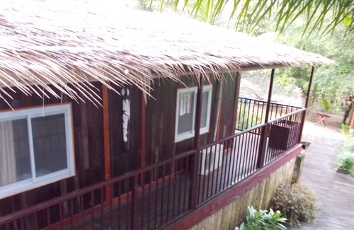 Azobé wooden chalet on the river and forest side. 3 bedrooms and 1 living room, kitchen area, 3 toilets and separate shower area. Ideal for families (up to 6 people with 2 bedrooms with 1 double bed and 1 bedroom with 2 single beds).