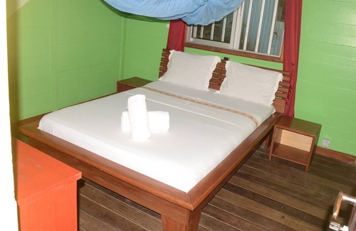 Azobé wooden chalet on the river and forest side. 3 bedrooms and 1 living room, kitchen area, 3 toilets and separate shower area. Ideal for families (up to 6 people with 2 bedrooms with 1 double bed and 1 bedroom with 2 single beds).