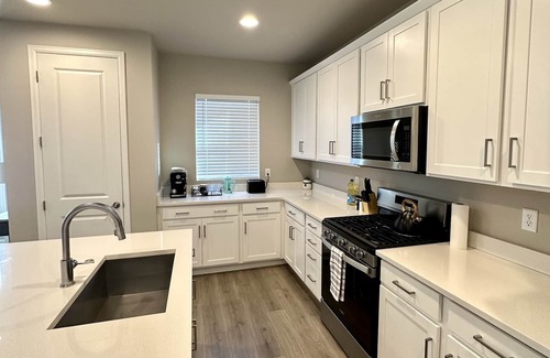As you walk in to the home you are greeted with an open concept living, dining and kitchen. The kitchen has beautiful white cabinets with quartz countertops and an island to eat breakfast at. You can cook your meals on the gas stove that even has an air fryer function. Dinning has seating for 6 people and right next to the dining area is a living area with a sofa and chair and a 45inch tv. Enjoy your time with relaxing outside on the patio or having your kiddos get some energy out in the backyard that is fenced in. The garage also has an EV charger for your use.