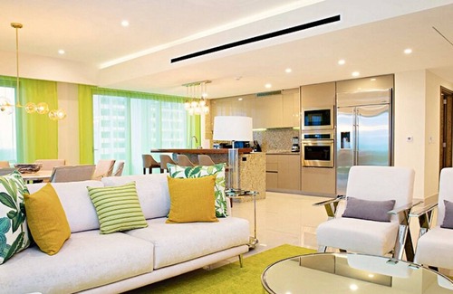 Spacious 4,813 sq. ft. modern condo. The suite has three bedrooms, three and a half baths, and a fully equipped kitchen with appliances. Beautiful view of the Caribbean ocean and Isla Mujeres. The balcony features a hammock, furniture and a private jacuzzi.