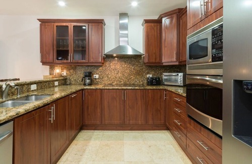 The condo has a fully-equipped gourmet kitchen with custom cabinetry, stunning marble counters, and all the cooking items you might need.
