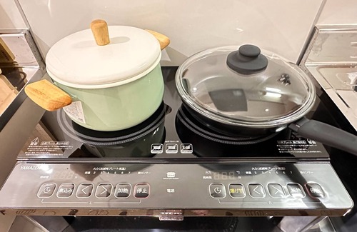 Kitchen equipped with frying pans pots rice cookers electric kettles cooking utensils and tableware