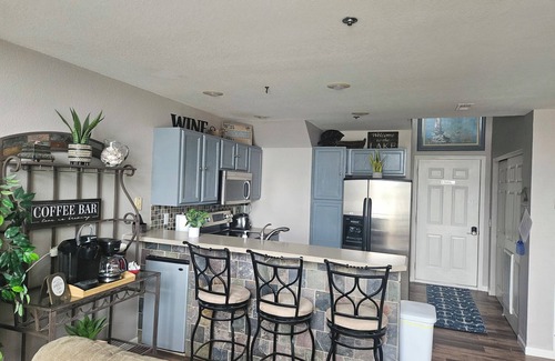 The Kitchen is fully stocked with everything you need to prepare your meals. There is also a gas grill on the deck for you to use while you watch the boats go by.